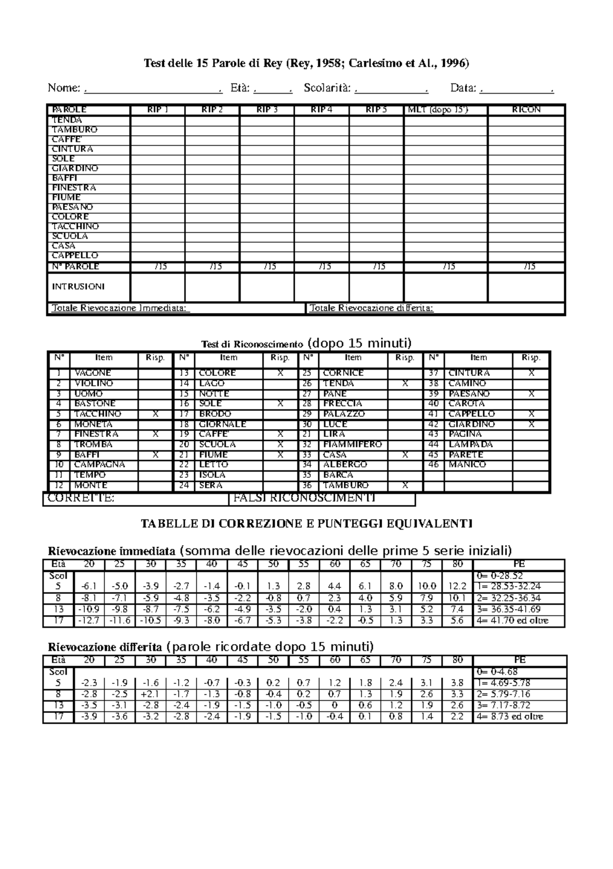 Test 15 Parole di Rey - Psicologia Cognitiva 501417 - UniPv - StuDocu