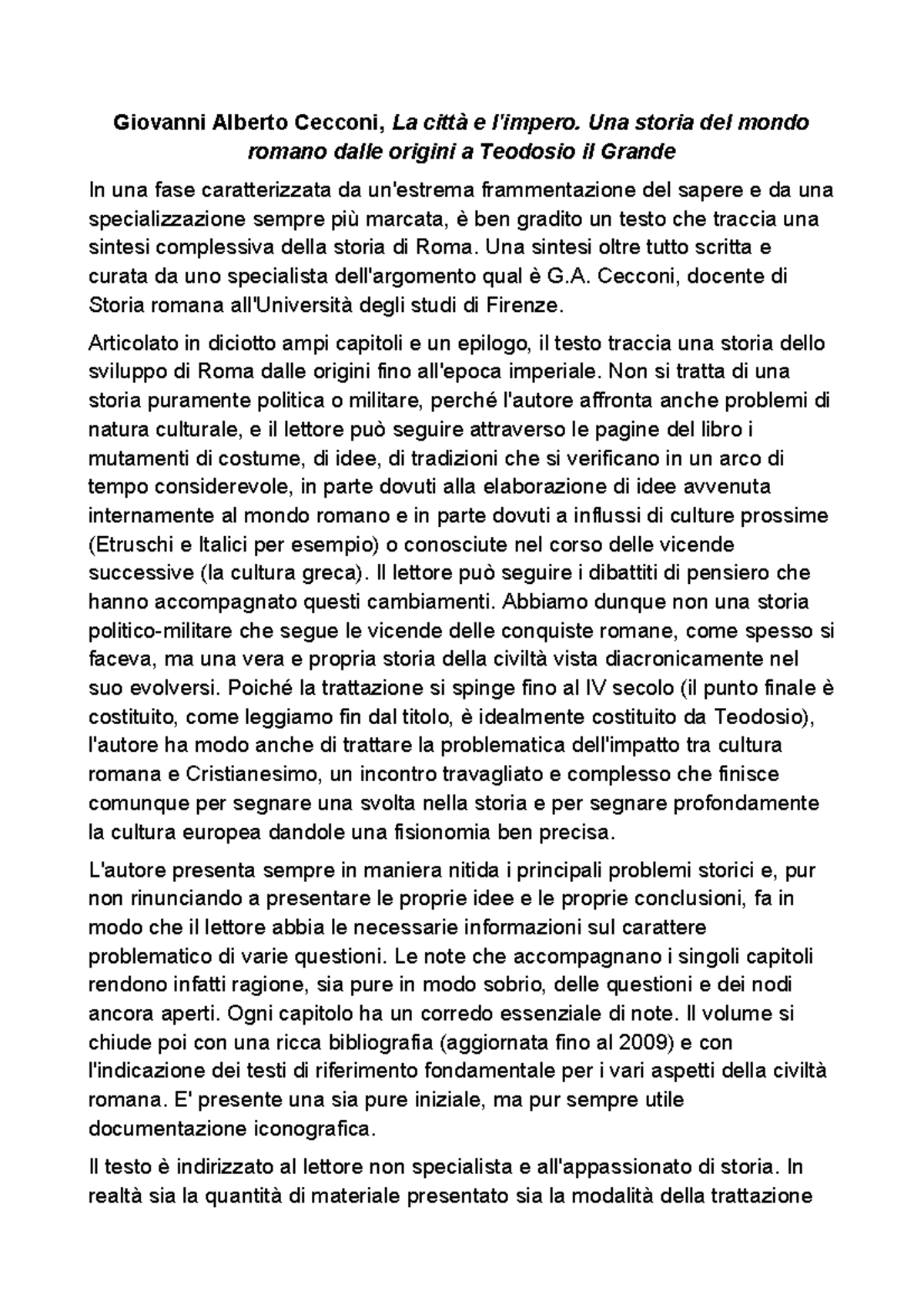 Riassunto esame storia romana, Prof. Buonopane, libro consigliato La città e l'impero, Cecconi ...